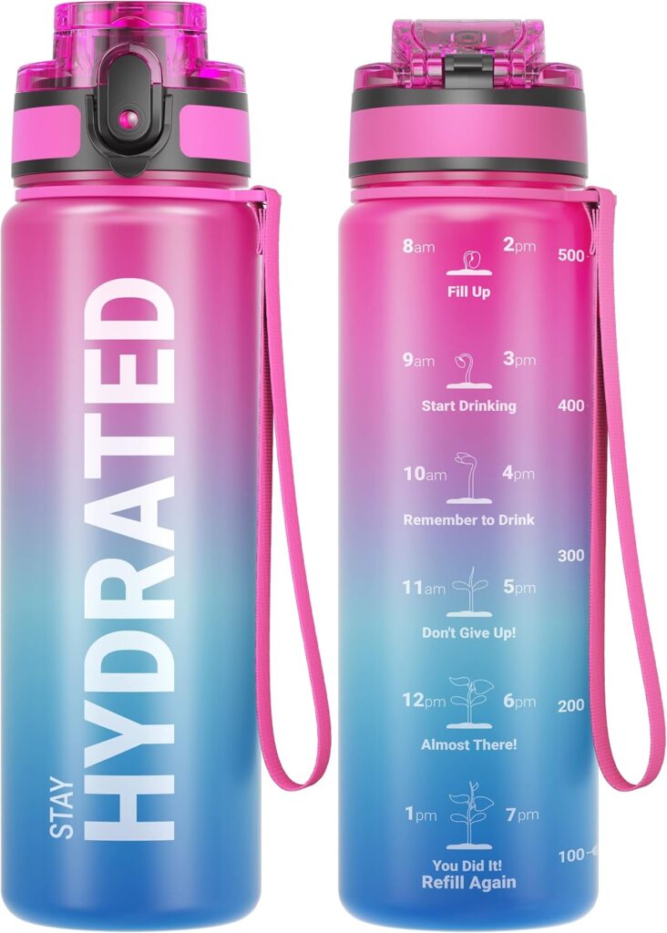 The bottle includes printed time markers that guide you on how much water to drink throughout the day. This helps build a consistent hydration habit.